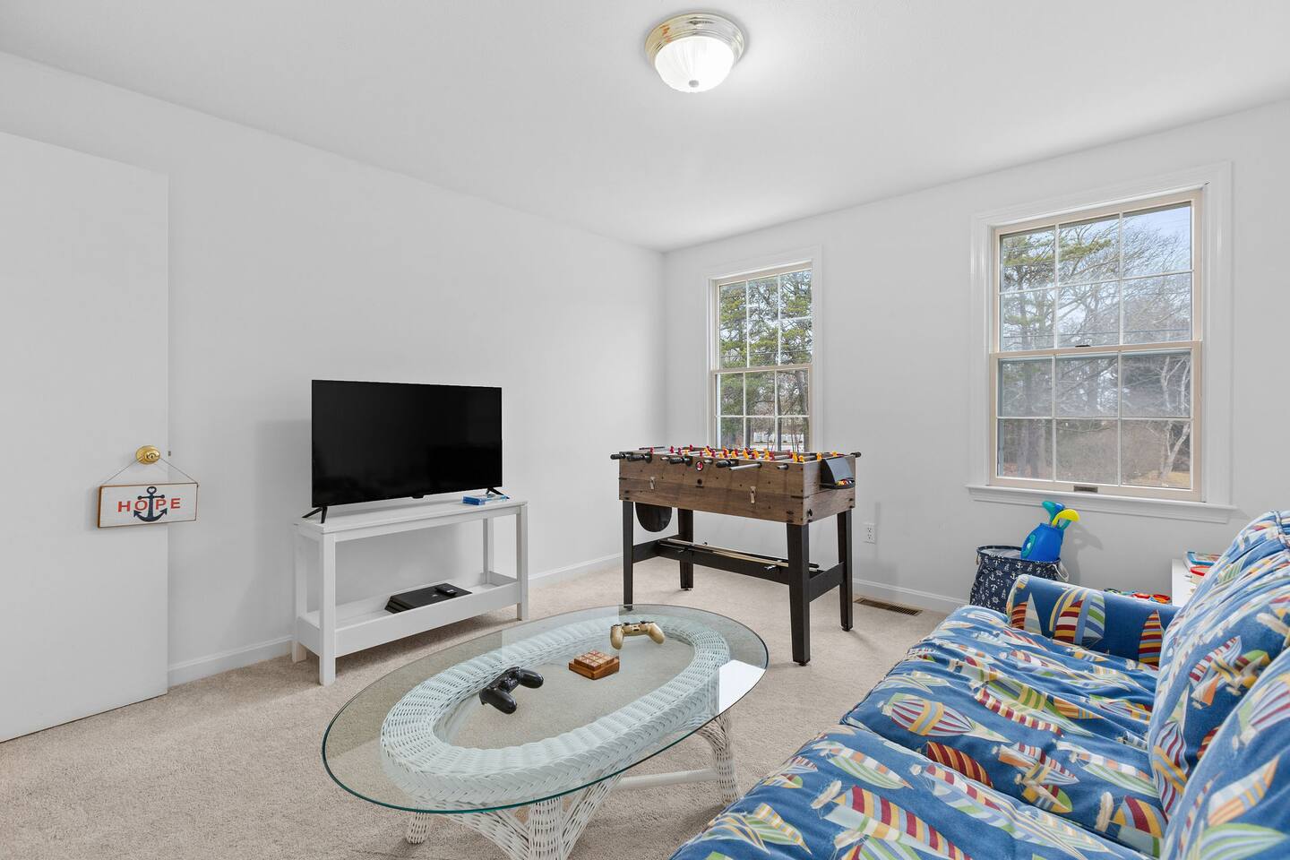Perfect for families or a group of friends this cozy home has spacious living areas & kid-friendly amenities! Enjoy a lovely deck, two living rooms, and a fun playroom with foosball, games, & books. Thoughtfully stocked for infants, toddlers, & kids—high chair, stroller, pack n play, & more—so you can travel light & relax. Plus, it's .5 miles to a beautiful, family-friendly beach. 1 min drive to Jacknife Beach 6 min drive to downtown Chatham Experience Chatham with us & Learn More Below!