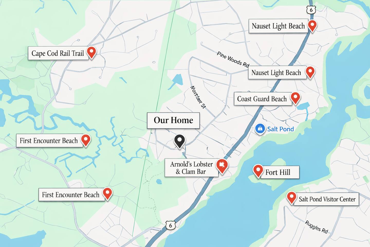 The space KEY FEATURES: ☀ Sleeps 12: 4 bedrooms + 1 bonus room (2 kings, 4 queens, 1 full, twin bunk beds) ☀ Bathrooms: 4.5 bathrooms ☀ Waterfront living: Bayfront home with a walking path leading directly to the water ☀ Hot tub on the deck ☀ Expansive deck with lounge chairs, outdoor dining table seating for 10 ☀ Private sauna ☀ Spacious game room with convertible pool/ping pong table ☀ Kayaks, canoes & paddleboards (stored on outdoor stands) ☀ Outdoor shower ☀ Firepit ☀ Bright, open living areas with water views ☀ Indoor dining table with seating for 8 ☀ Fully equipped kitchen with stainless steel appliances & island seating ☀ Spacious outdoor areas for relaxing and gathering ☀ Keyless entry ☀ Washer & Dryer ☀ Boat house: Perfect for storing gear and launching bay adventures ☀ Dedicated worksapce ☆☆ BEDROOMS ☆☆ This spacious waterfront home comfortably accommodates up to 12 guests, all beds are fitted with hotel quality linens. First Floor: - Bedroom #1: Queen bed - Bedroom #2: King bed + water views Second Floor - Bedroom #3 (Primary): King bed + ensuite bathroom + smart TV - Bedroom #4: Queen bed + full bed + twin bunk beds + ensuite bathroom Above the Garage - Bedroom #5 (Bonus Suite): Two queen beds + desk + TV ☆☆ BATHROOMS ☆☆ All full bathrooms are stocked with shampoo, conditioner, body wash, hand soap, lotion, towels, and hair dryers. First Floor - Bathroom #1: Half bathroom (outdoor shower located just outside) - Bathroom #2: Full bathroom with walk in shower Second Floor - Bathroom #3: Full ensuite with walk in shower & tub - Bathroom #4: Full ensuite with walk in shower Basement - Bathroom #5: Full bathroom with walk in shower ☆☆ KITCHEN & LIVING AREAS ☆☆ Kitchen: Large, well-equipped kitchen with stainless steel appliances, island seating for 5, fireplace, coffee bar, TV and ample prep space. Main living & dining area: Open-concept, light-filled space with water views and direct access to the deck, breakfast bar, fireplace, reading room and dinning room with seating for 8. Basement: Secondary living area with sauna, kitchenette, smart TV and a convertible game table (ping pong + pool) — perfect for group fun and spreading out. ☆☆ OUTDOOR SPACE ☆☆ Deck & patio: Hot tub, grill, seating areas, and space for relaxing or entertaining Water access: Private path leading from the yard directly down to the water Boat house & storage shed: Houses kayaks, canoes, paddleboards & water gear Outdoor shower: Enclosed and ideal after beach or water days ☆☆ HOT TUB NOTE ☆☆ Hot tub will be open 4/15-10/31 Availability can be expanded based on booking requests. ☆☆ HOUSE RULES ☆☆ - No events or parties. - No more than 12 guests max allowed at the home. - No pets. - No smoking. - Quiet hours: 10pm-8am - No food or drink other than water in the living areas or bedrooms. - This is a private family home, please be respectful. ☆☆ PROXIMITY TO BEACHES ☆☆ - Rock Harbor Beach ~2.0 miles - First Encounter Beach ~2.3 miles - Coast Guard Beach ~3.0 miles - Nauset Light Beach ~3.8 miles - Thumpertown Beach ~4.5 miles - White Crest Beach ~9.5 miles ☆☆ PROXIMITY TO ATTRACTIONS ☆☆ - Cape Cod National Seashore Salt Pond Visitor Center ~2.7 miles - Cape Cod Rail Trail Access (Eastham) ~1.5 miles - Nauset Lighthouse ~5.2 miles - Mass Audubon Wellfleet Bay Wildlife Sanctuary ~6.3 miles - Nickerson State Park ~6.1 miles - Orleans Main Street (shops & dining) ~6.5 miles ★★★ Book your stay and enjoy unforgettable bayfront living on the Outer Cape in Eastham ★★★